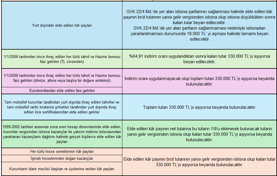 Gerçek kişilerce 2025 takvim yılında elde edilen menkul sermaye iratlarının bir kısmı beyan edilecek gelir toplamının 330.000 TL’yi (2026 takvim yılı için 400.000 TL) aşması halinde, bir kısmı ise vergi kesintisine ve istisnaya tabi olmadıkları için 18.000 TL’yi (2026 takvim yılı için 22.000 TL) aşması halinde yıllık beyanname ile beyan edilecektir. Bazı iratlar ise tutarı ne olursa olsun beyan edilmez.